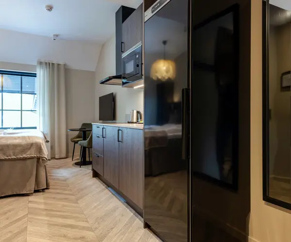 The apartment is 24 sqm and has 2-3 beds in one room (double bed + 1 single bed that fold out from the wall). Kitchenette (hot plates, microwave, refirgerator, electric kettle and coffee maker) and bathroom. There is also a drying cabinet in the apartment.