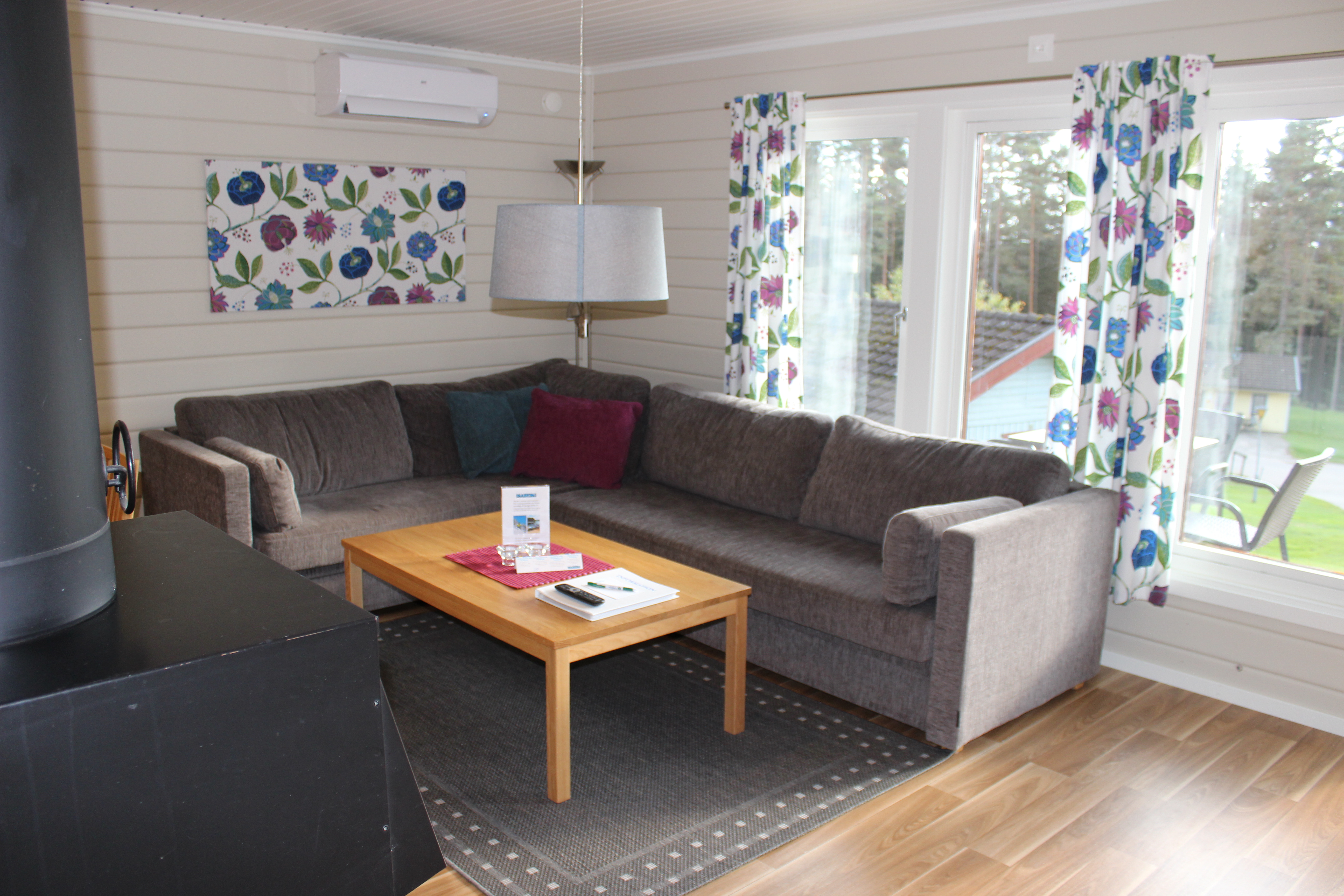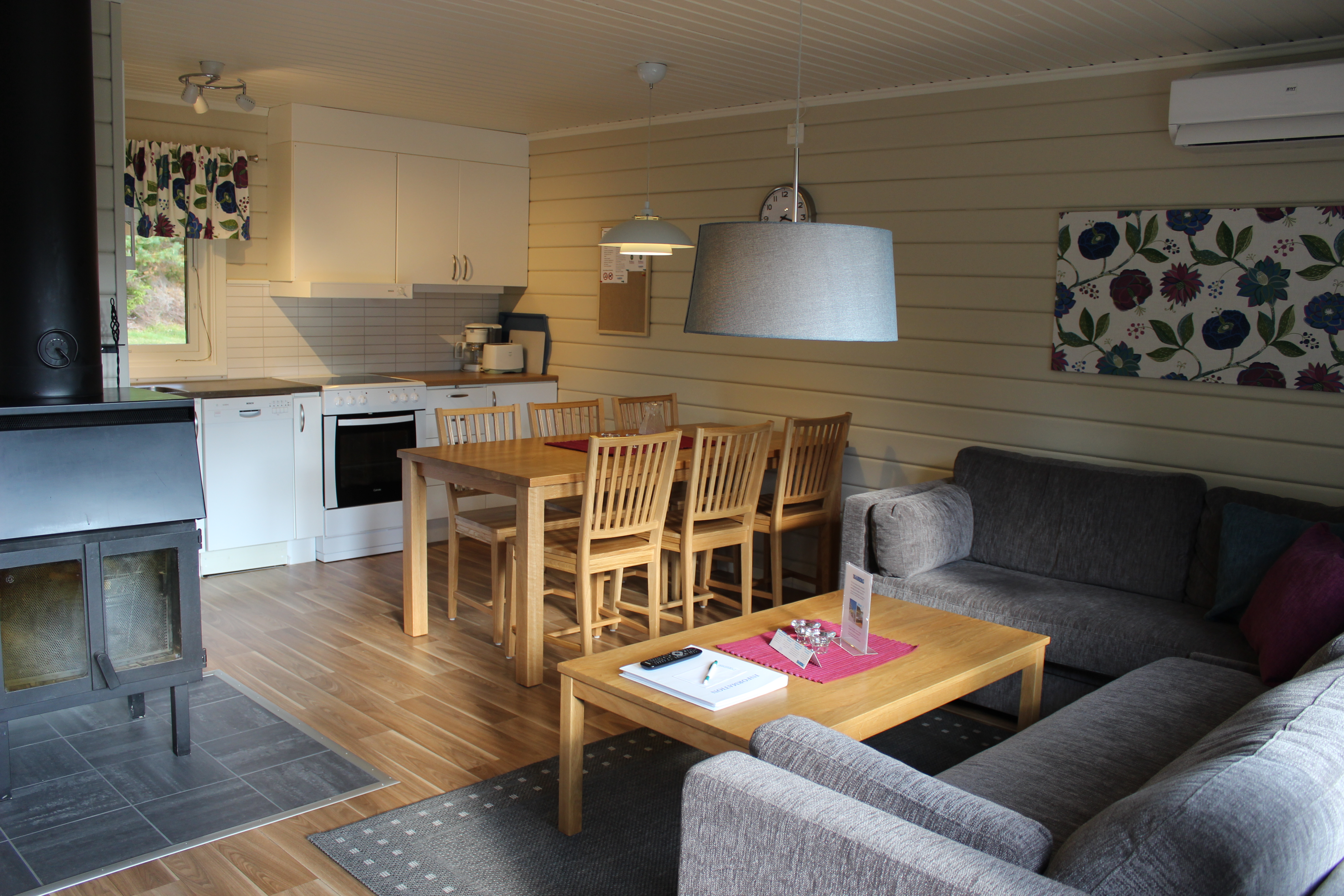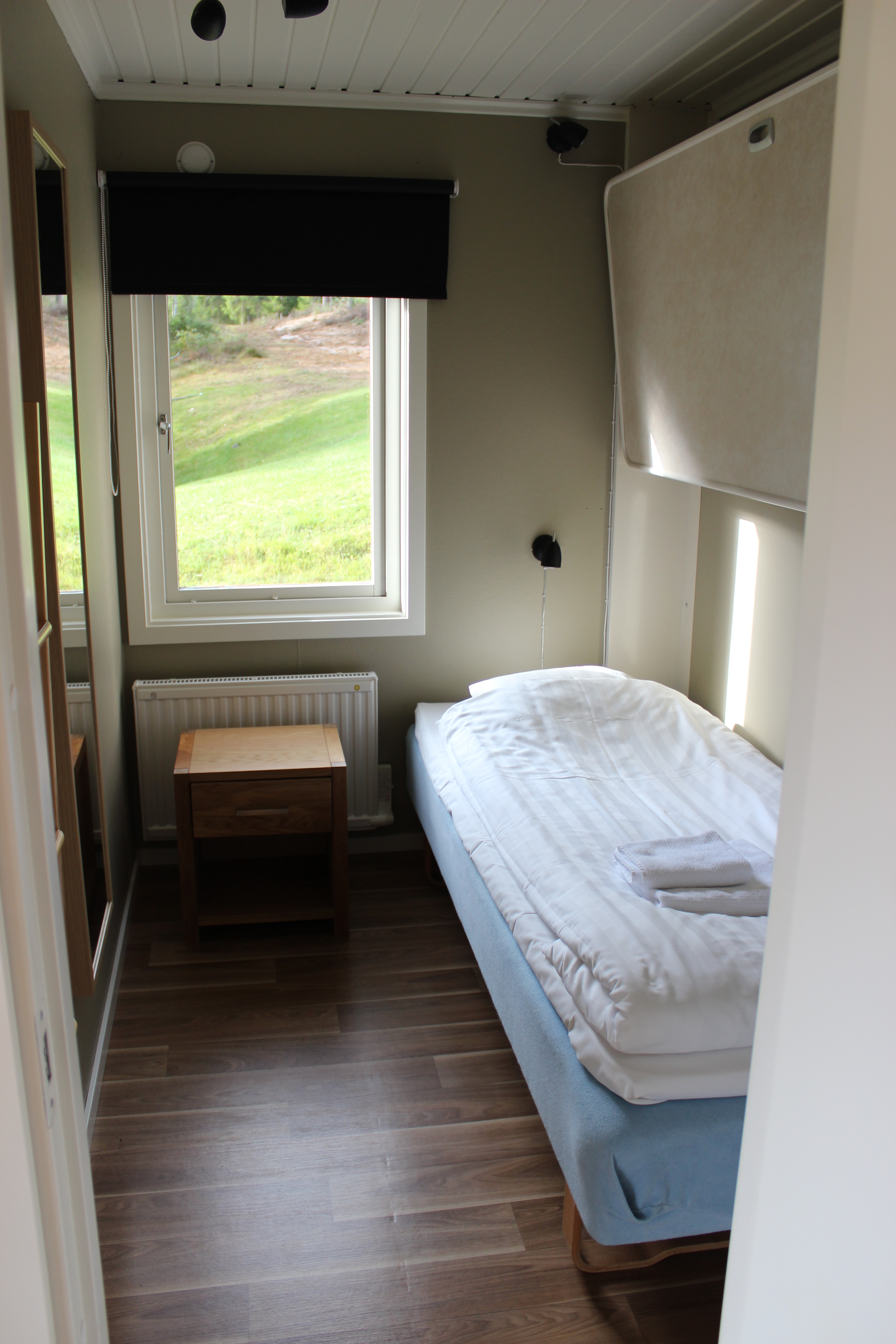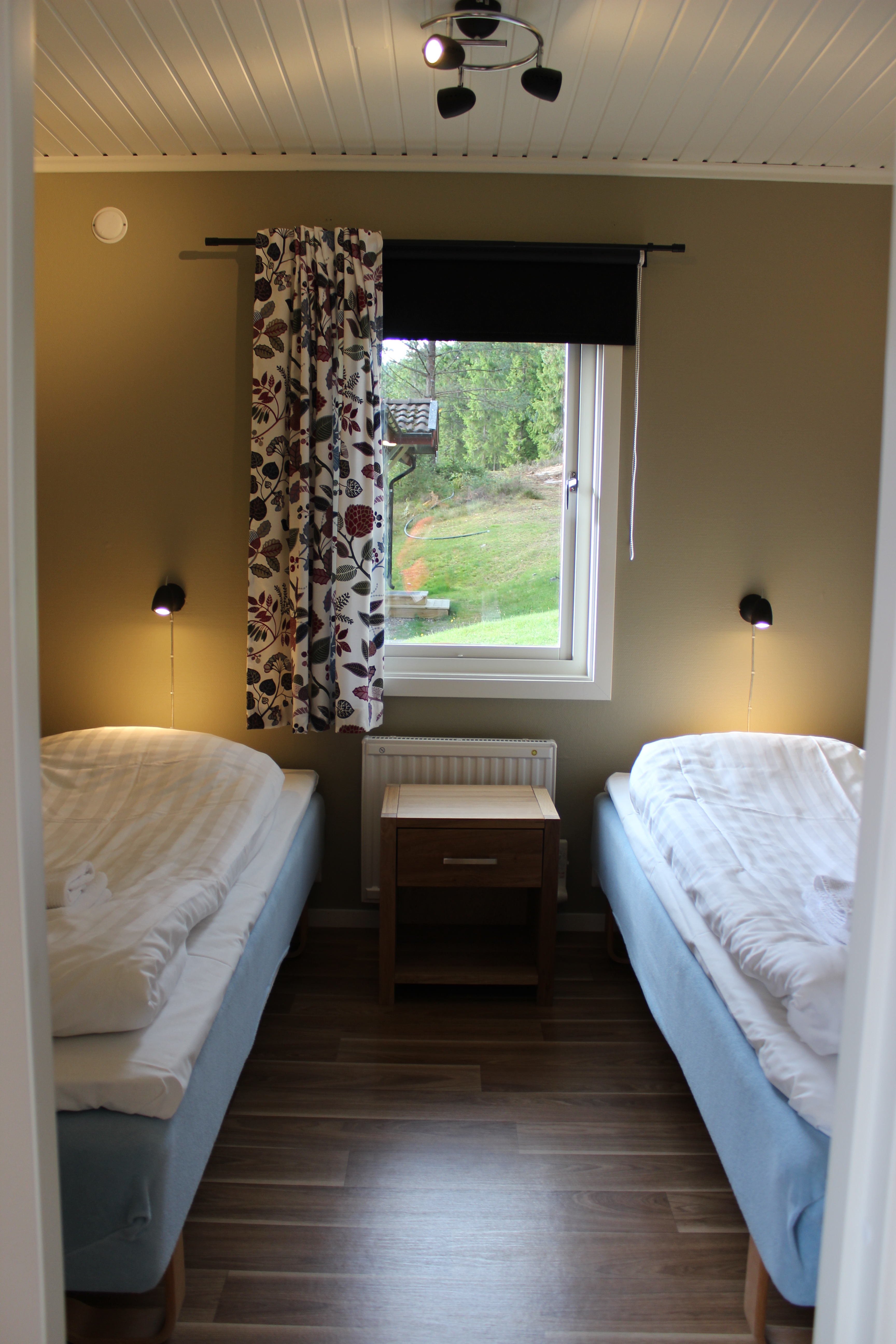 The cabin has two bedrooms, one with two single beds and one with a bunk-bed. The single beds are 90 cm wide. The top bed is 80 cm wide and the lower bed is 90 cm wide. There is also a sofa-bed in the living room (1 adult or 2 smaller children).