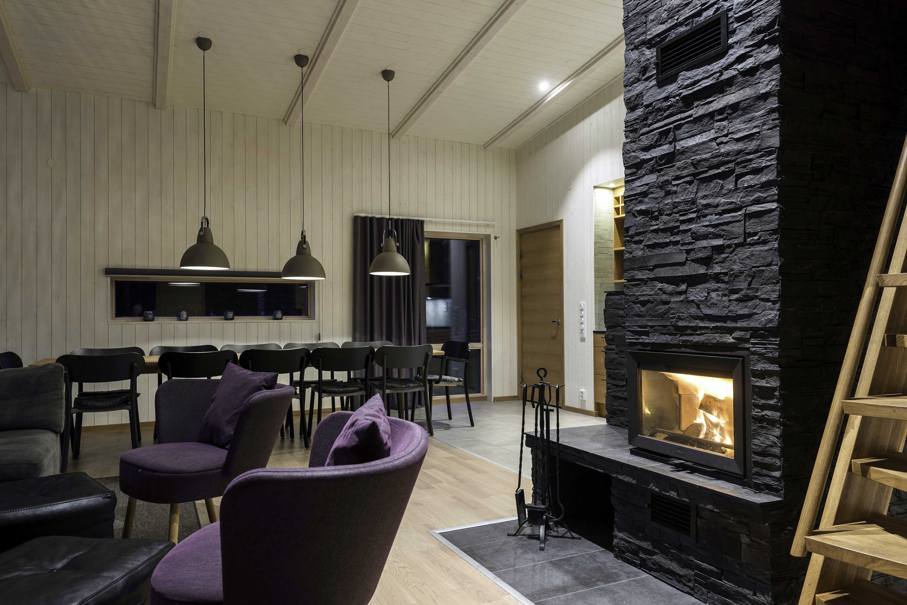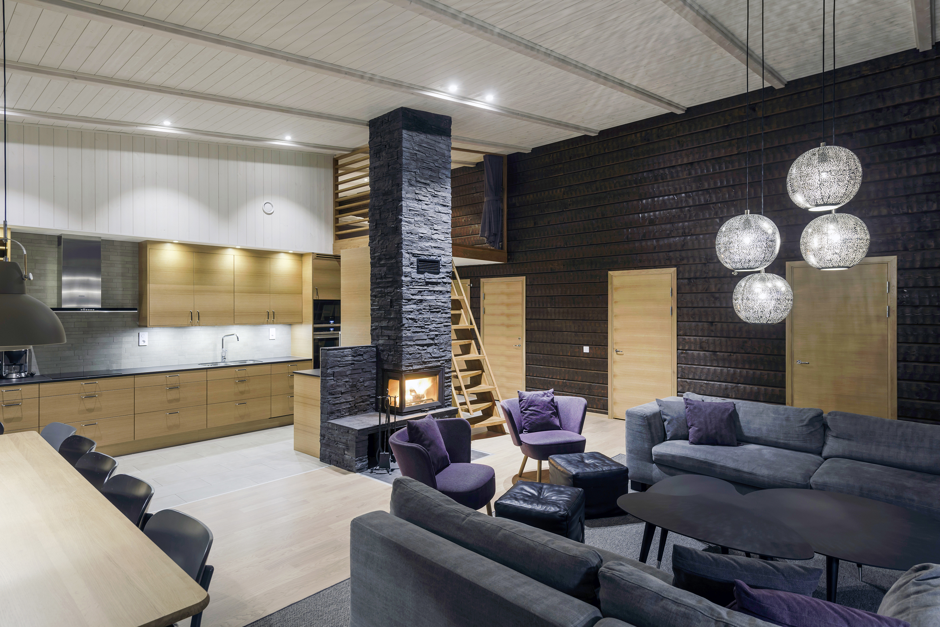 Våra stora hus med plats för många bjuder på en upplevelse i sig. Genom hela husets längd går en grovhuggen timmervägg som skapar en härlig atmosfär.