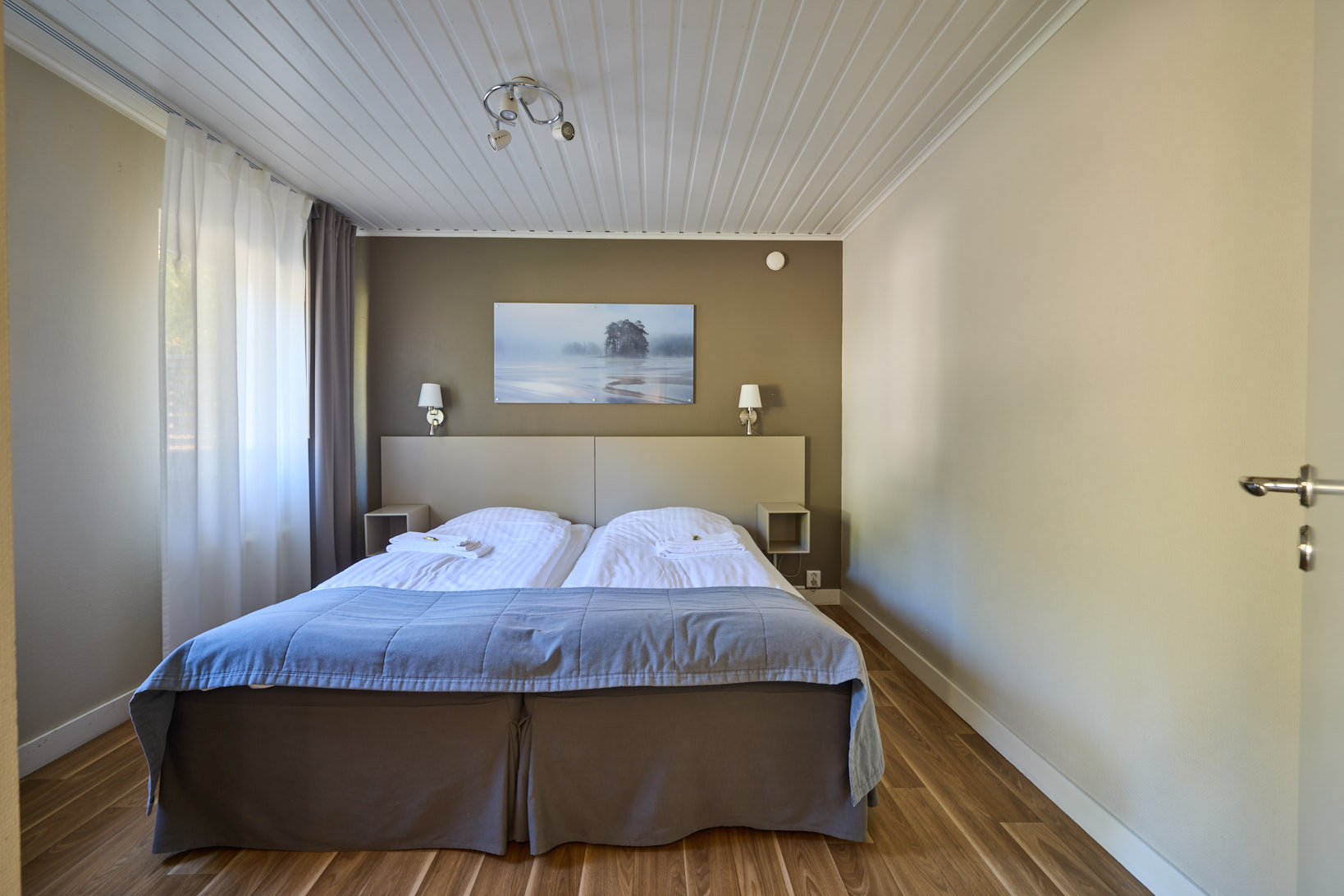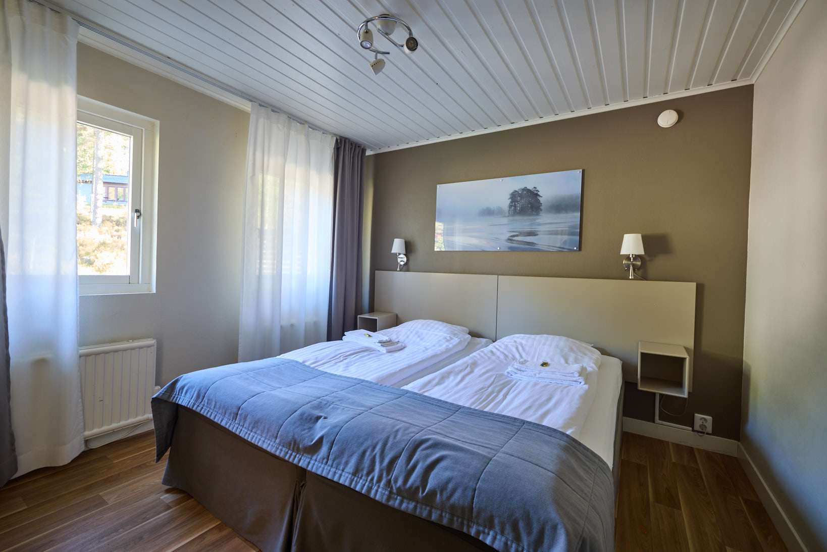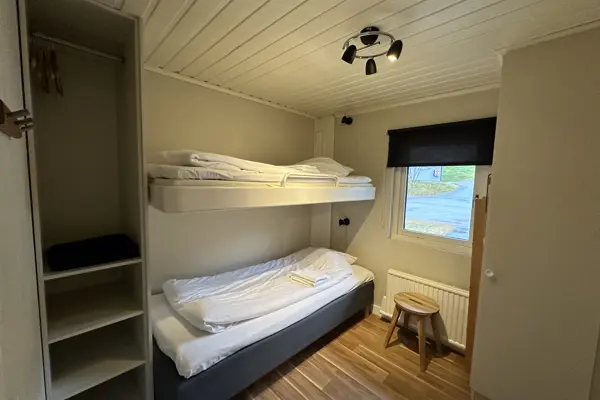 Stugan har två sovrum, ett med dubbelsäng och ett med våningssäng, samt bäddsoffa (2 mindre barn alt. 1 vuxen) i vardagsrummet.