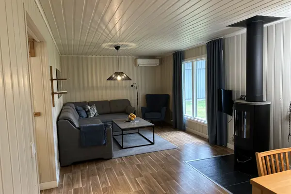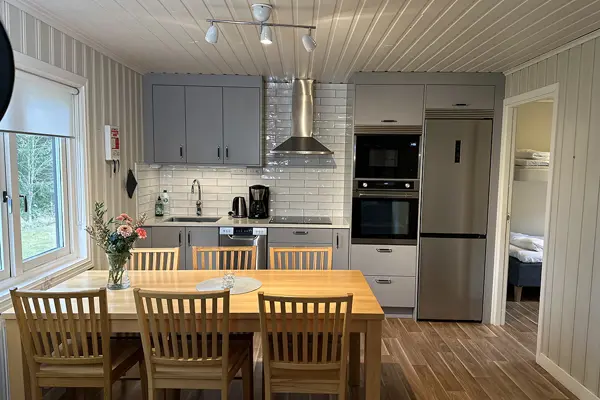 I vardagsrummet finns, förutom bäddsoffa, även TV, öppen spis och matplats till 6 pers. Köket har spis, ugn, micro, kyl, frys och diskmaskin. I köket finns också bland annat porslin, bestick, glas, grytor, stekpanna, brödrost, kaffebryggare och vattenkokare.