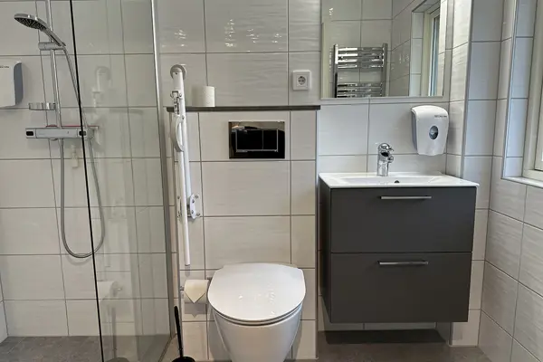 Toalett och dusch i stugan. Alla stugor har torkskåp.
