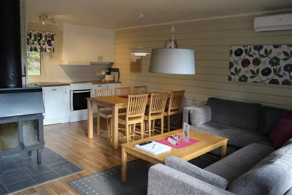 I vardagsrummet finns, förutom soffa, också TV, öppen spis även matplats till 6 pers.