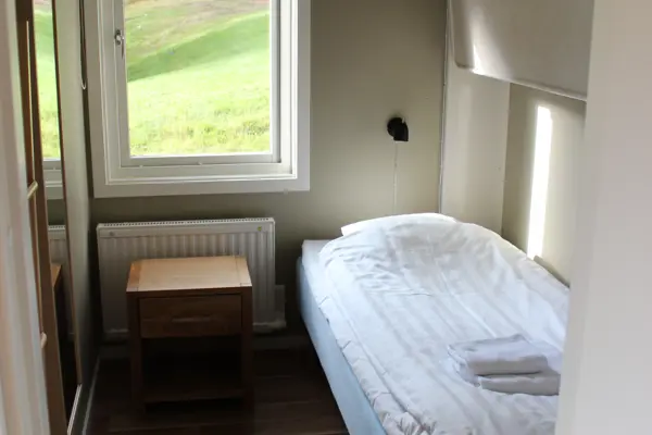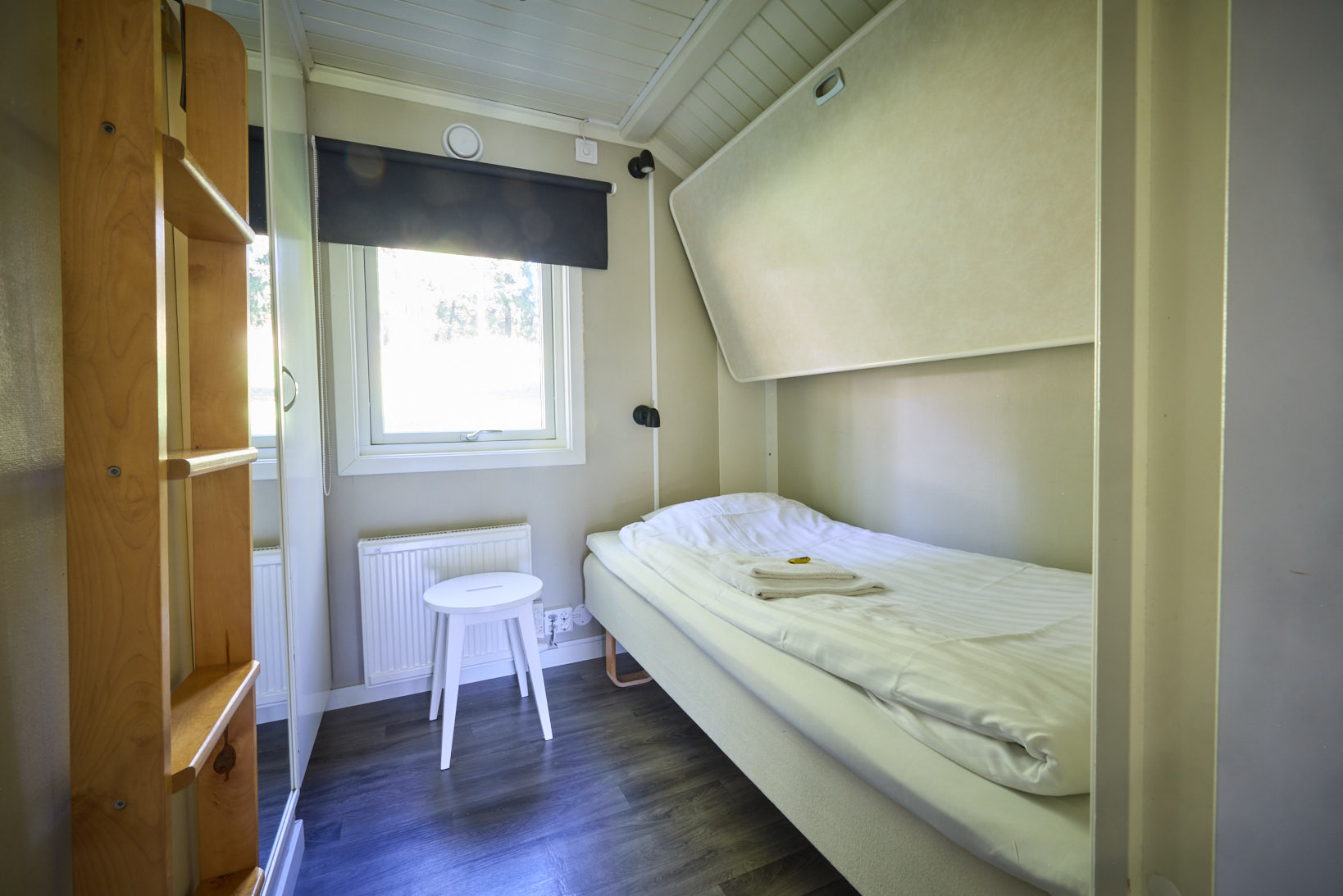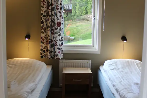 Stugan har två sovrum, ett med två enkelsängar och ett med en våningssäng. Enkelsängarna är 90cm breda. Överslafen i våningssängen är 80cm bred och underslafen 90 cm bred. Fallskydd finns till överslafarna i garderoben.
