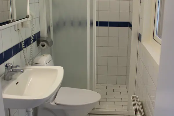 Toalett och dusch i stugan. Alla stugor har torkskåp.